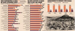 Η κατάσταση φαίνεται να επιβάρυνε το ήδη δύσκολο περιβάλλον που υπήρχε. Αρκεί να δει κανείς τα στοιχεία της Eurostat, σύμφωνα με τα οποία το 2021 το ποσοστό εκείνων που παρουσίασαν καθυστερήσεις στις πληρωμές για κόστη στέγασης (ενοίκιο ή στεγαστικόκαι λογαριασμοί) έφτασε στην Ελλάδα το 2021 στο 36,4% και στην πρώτη θέση, με τη Βουλγαρία να ακολουθεί με 20,4%, την Κύπρο με 17,3%, την Κροατία με 16,6%, την Ισπανία με 14,3% και την Ιρλανδία με 13,6%. Χαμηλότερα ήταν τα ποσοστά σε Τσεχία (2,4%), Ολλανδία (2,6%), Βέλγιο (4,2%) και Αυστρία (4,8%).