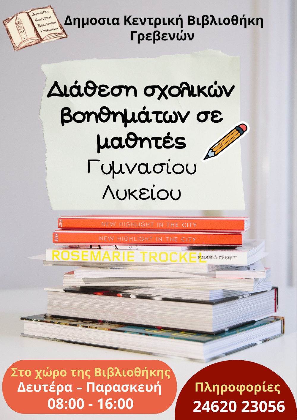 Η Δημόσια Κεντρική Βιβλιοθήκη Γρεβενών ανακοινώνει τη διάθεση σχολικών βοηθημάτων σε μαθητές, Γυμνασίου και Λυκείου, με τη μορφή δανεισμού για ένα (1) σχολικό έτος.