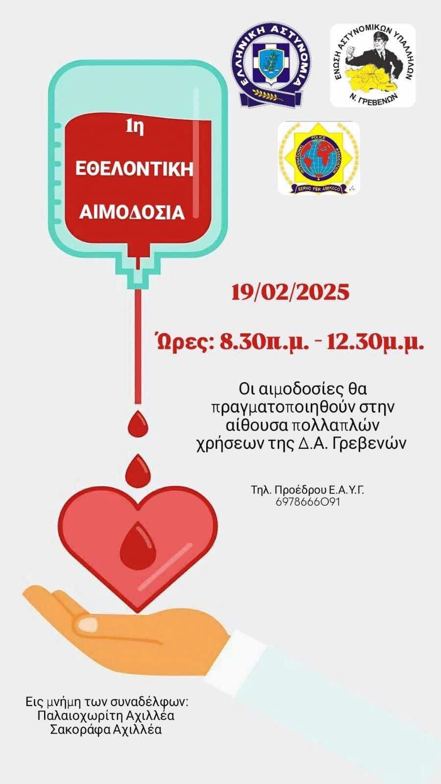 Με ιδιαίτερη μεγάλη επιτυχία οργανώθηκε και πραγματοποιήθηκε, την Τετάρτη 19 Φεβρουαρίου 2025, η 1η εθελοντική αιμοδοσία από τη Διεύθυνση Αστυνομίας Γρεβενών από κοινού με την Ένωση Αστυνομικών Υπαλλήλων Γρεβενών και την Τοπική Διοίκηση Γρεβενών της Διεθνούς Ένωσης Αστυνομικών (ΙΡΑ), με μέριμνα του Τμήματος Αιμοδοσίας του Γενικού Νοσοκομείου Γρεβενών, στην αίθουσα πολλαπλών χρήσεων του Αστυνομικού Μεγάρου Γρεβενών.