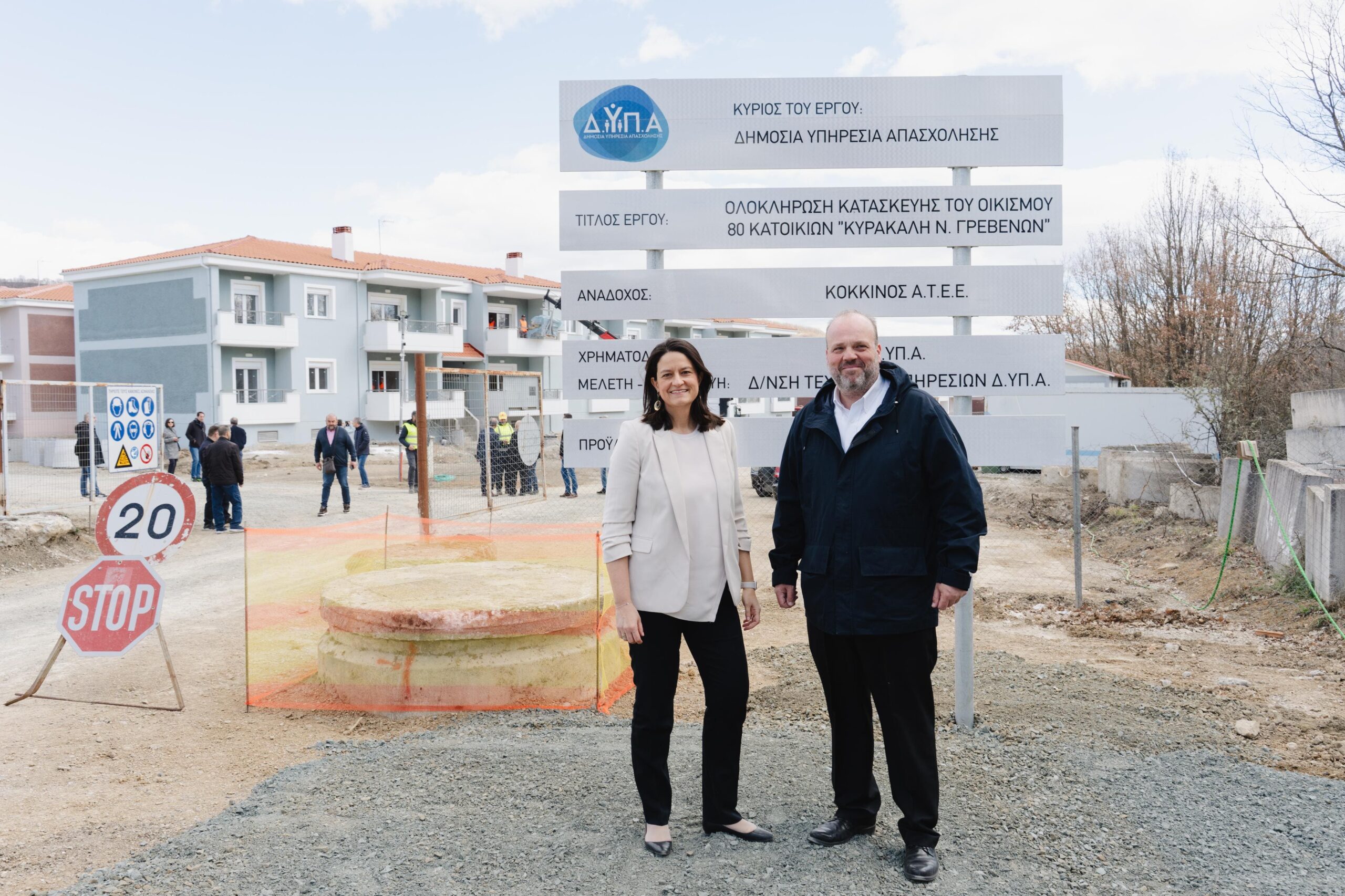 Η Υπουργός Εργασίας και Κοινωνικής Ασφάλισης Νίκη Κεραμέως και ο Διοικητής της Δημόσιας Υπηρεσίας Απασχόλησης (ΔΥΠΑ) Σπύρος Πρωτοψάλτης επισκέφθηκαν σήμερα τον υπό κατασκευή οικισμό κατοικιών στην Κυρακαλή Γρεβενών, μαζί με κλιμάκιο στελεχών της ΔΥΠΑ.