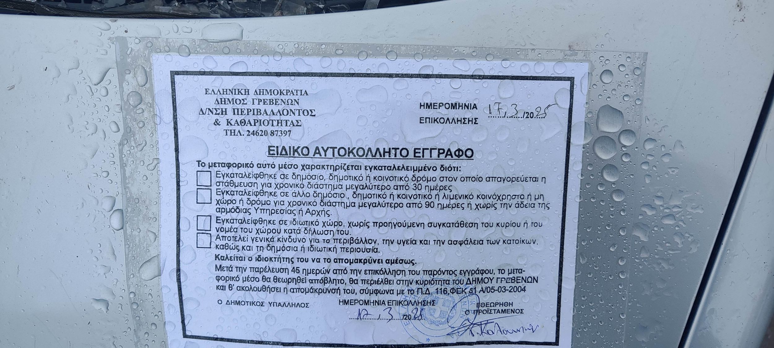 Ο Δήμος Γρεβενών ενημερώνει ότι ξεκίνησε από τις 17 Μαρτίου η διαδικασία σήμανσης, περισυλλογής και εκποίησης των εγκαταλελειμμένων οχημάτων στην επικράτειά του. Ο εντοπισμός και η απομάκρυνση γίνεται από τη Διεύθυνση Καθαριότητας.