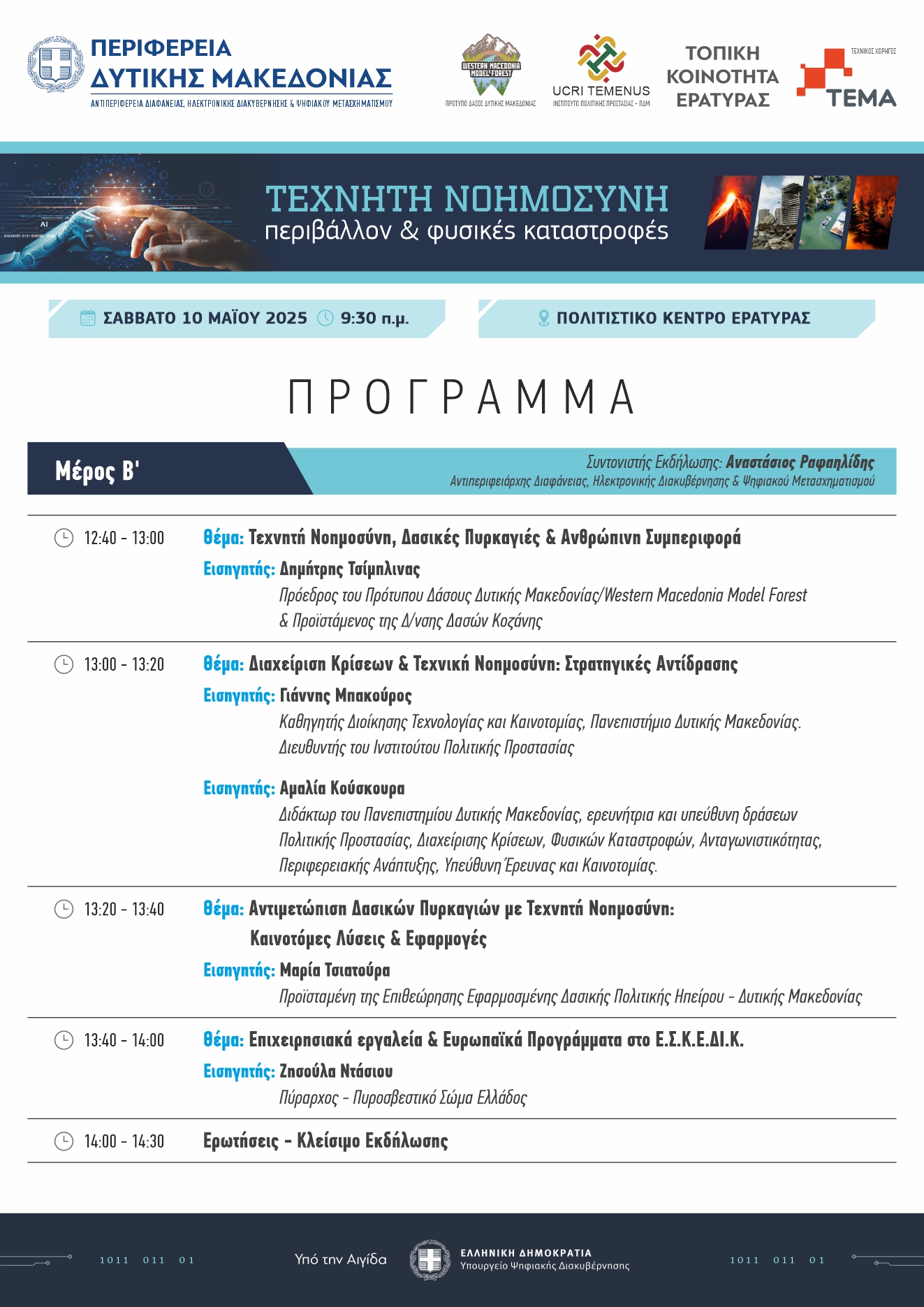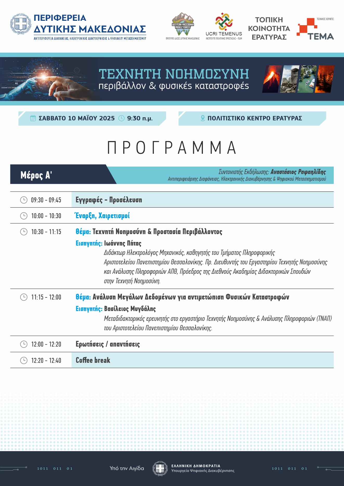 Για το πρόγραμμα, την τοποθεσία της Ημερίδας και περισσότερες πληροφορίες εδώ: ΗΜΕΡΙΔΑ “Τεχνητή Νοημοσύνη, Περιβάλλον & Φυσικές Καταστροφές” – Περιφέρεια Δυτικής Μακεδονίας