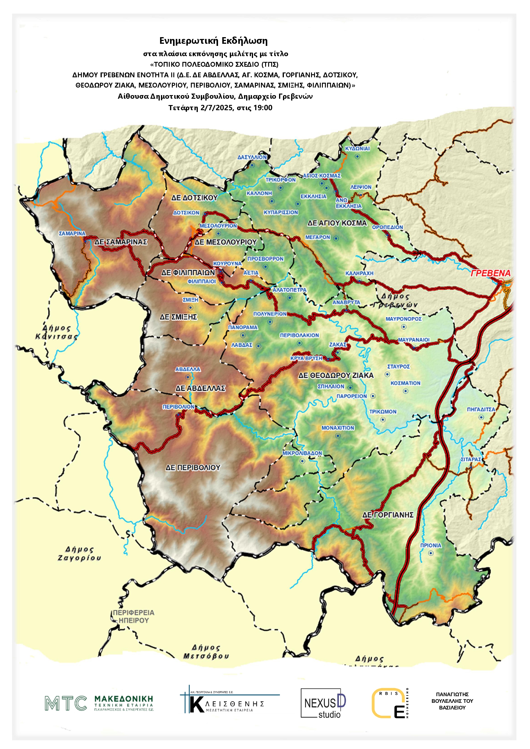 Πρόσκληση σε ενημερωτική εκδήλωση στα πλαίσια εκπόνησης μελέτης με τίτλο «ΤΟΠΙΚΟ ΠΟΛΕΟΔΟΜΙΚΟ ΣΧΕΔΙΟ ΔΗΜΟΥ ΓΡΕΒΕΝΩΝ ΕΝΟΤΗΤΑ ΙΙ (ΔΕ ΑΒΔΕΛΛΑΣ, ΑΓ. ΚΟΣΜΑ, ΓΟΡΓΙΑΝΗΣ, ΔΟΤΣΙΚΟΥ, ΘΕΟΔΩΡΟΥ ΖΙΑΚΑ, ΜΕΣΟΛΟΥΡΙΟΥ, ΠΕΡΙΒΟΛΙΟΥ, ΣΑΜΑΡΙΝΑΣ, ΣΜΙΞΗΣ, ΦΙΛΙΠΠΑΙΩΝ)»