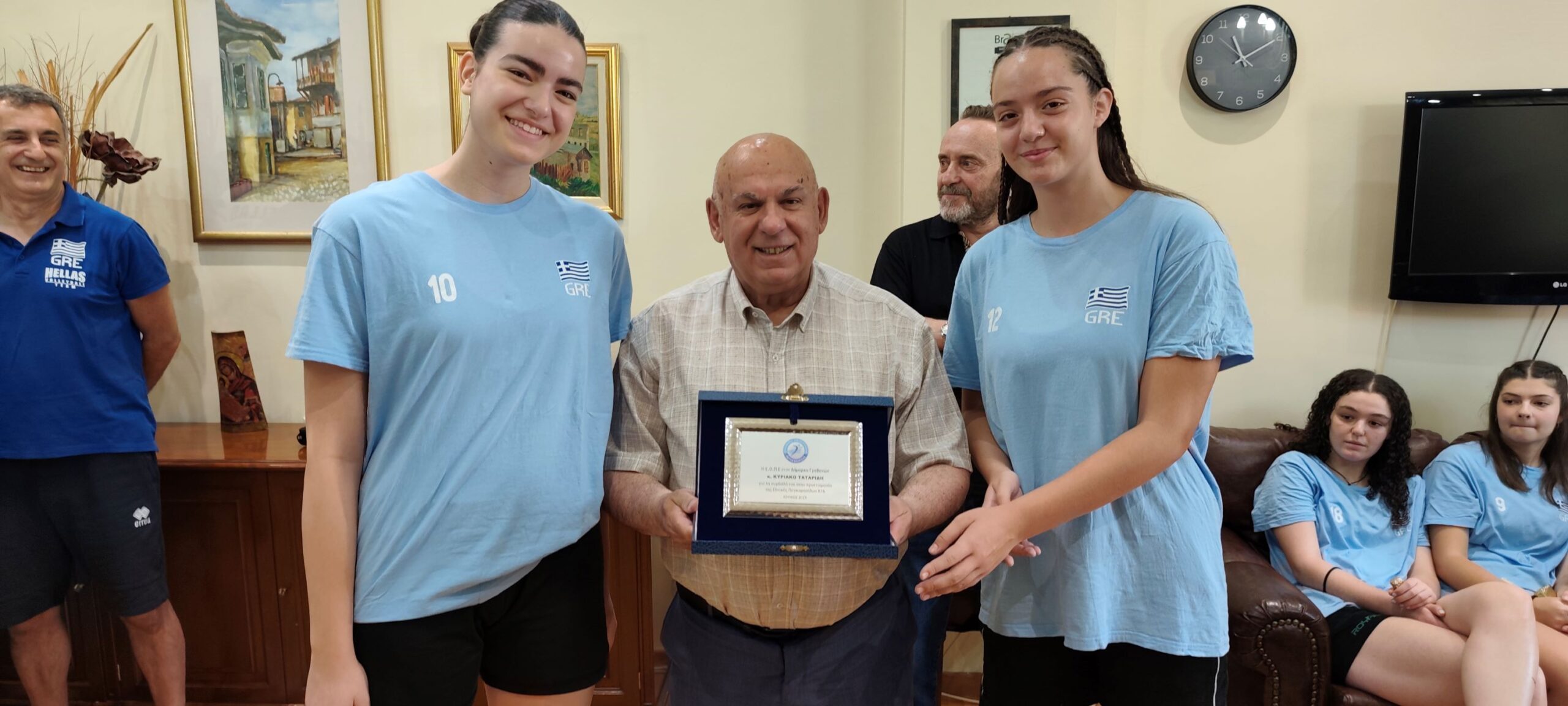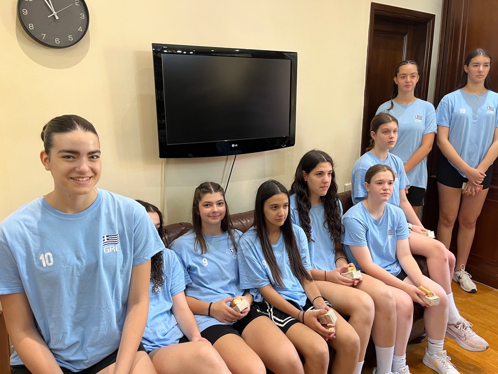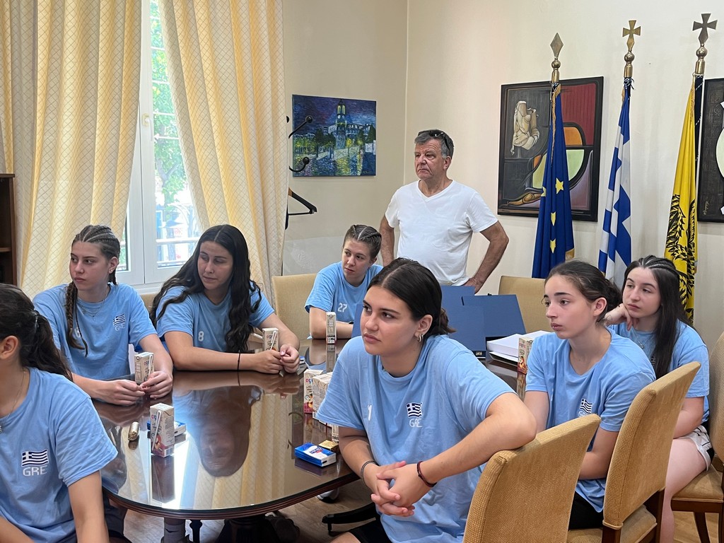 Η ημέρα ξεκίνησε με την επίσκεψη στο Δημαρχείο, όπου ο Δήμαρχος κ. Κυριάκος Ταταρίδης και μέλη της Δημοτικής Αρχής υποδέχθηκαν θερμά την αποστολή της Εθνικής Ομάδας. Σε κλίμα συνεργασίας και αμοιβαίας εκτίμησης, απονεμήθηκαν τιμητικές πλακέτες από την Ε.Ο.ΠΕ. στον Δήμαρχο, στον Γενικό Γραμματέα κ. Ιωάννη Ντόλια, στους Αντιδημάρχους κ. Σοφοκλή Κυπριτζή και κ. Αχιλλέα Καραμήτρο, καθώς και στον κ. Τάσο Γκόλια, υπεύθυνο της Μαθητικής Εστίας.