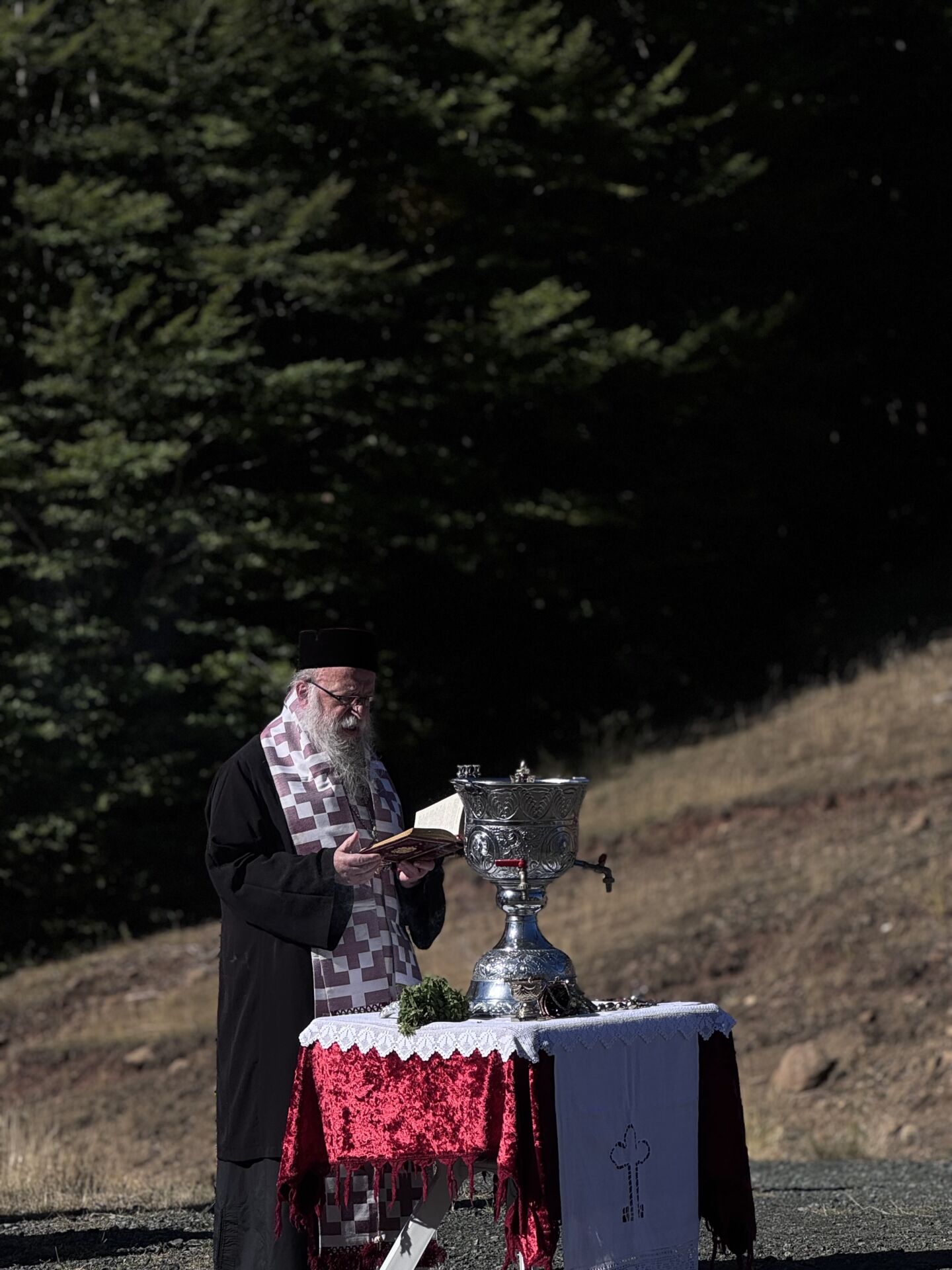 Μετά το πέρας της Θείας Λειτουργίας και υπό τη σκιά των πεύκων, ο Σεβασμιώτατος τέλεσε τον καθιερωμένο Αγιασμό του νέου μηνός και του νέου εκκλησιαστικού έτους, ευλογώντας τους πιστούς που προσήλθαν για να συμπροσευχηθούν στον αχειροποίητο ναό του Θεού: τη φύση.
