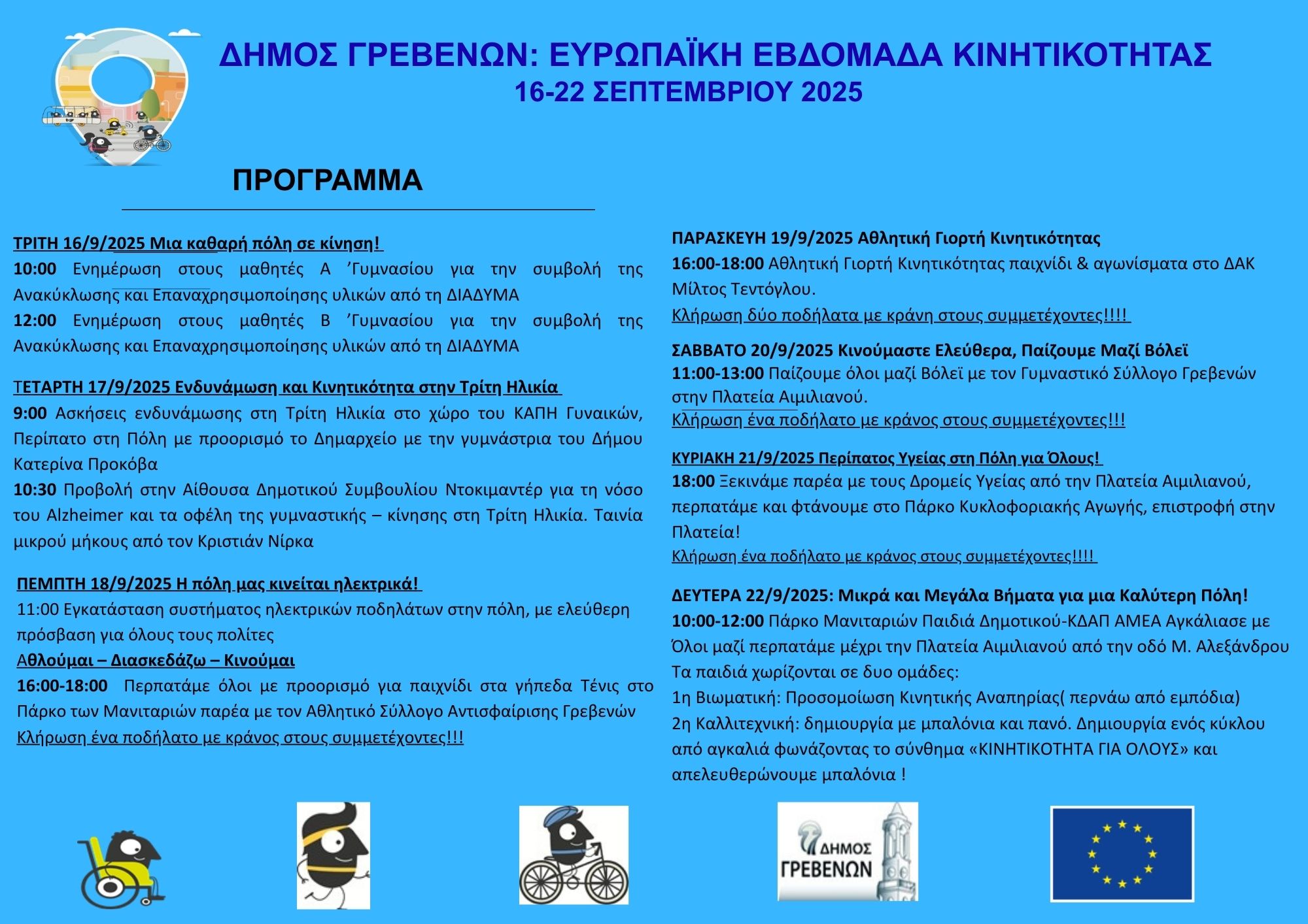 Αναλυτικά το πρόγραμμα εκδηλώσεων της φετινής Ευρωπαϊκής Εβδομάδας Κινητικότητας στον Δήμο Γρεβενών, είναι το εξής: