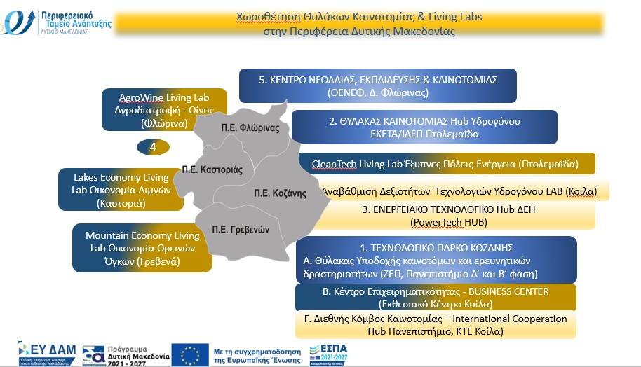 Στο πλαίσιο της Δίκαιης Αναπτυξιακής Μετάβασης, έχουν εξασφαλιστεί σημαντικοί πόροι και έχουν δρομολογηθεί φιλόδοξες πρωτοβουλίες. Στην Κοζάνη λειτουργούν το Τεχνολογικό Πάρκο και το Επιχειρηματικό Κέντρο, στην Πτολεμαΐδα ο Θύλακας Υδρογόνου και το CleanTech Lab, αξιοποιώντας την ενεργειακή κληρονομιά της περιοχής, ενώ στη Φλώρινα αναπτύσσεται το AgroWine Living Lab και το Κέντρο Νεολαίας, Εκπαίδευσης & Καινοτομίας. Στην Καστοριά λειτουργεί το Lakes Economy Living Lab για βιώσιμη αξιοποίηση του φυσικού πλούτου, ενώ στα Γρεβενά το Mountain Economy Living Lab επικεντρώνεται στην ανάπτυξη της ορεινής οικονομίας.