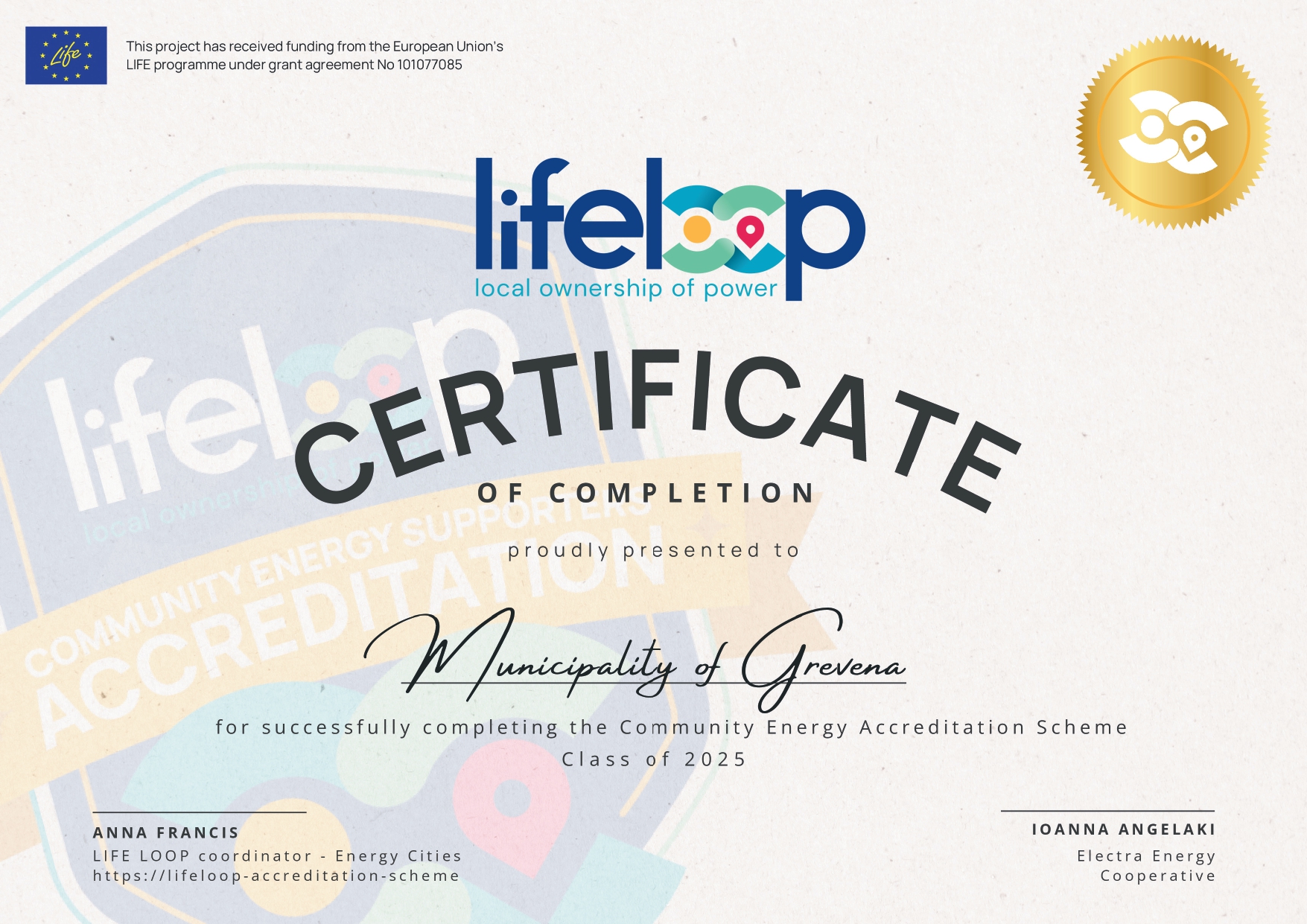Παράλληλα, ο Δήμος Γρεβενών, προετοιμάζεται, έχοντας πιστοποιηθεί σε θέματα σύστασης και λειτουργίας Ενεργειακών Κοινοτήτων από το Ευρωπαϊκό Πρόγραμμα Lifeloop.