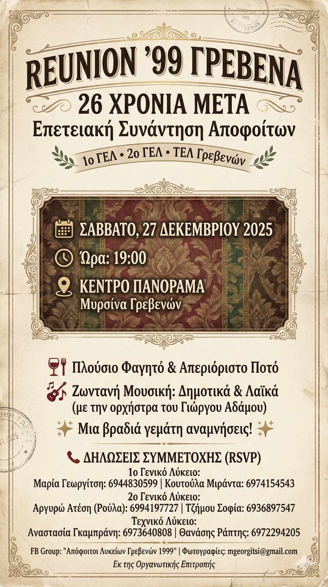 Επετειακή Συνάντηση Αποφοίτων Λυκείων της πόλης των Γρεβενών του έτους 1999 – 26 χρόνια μετά την αποφοίτηση
