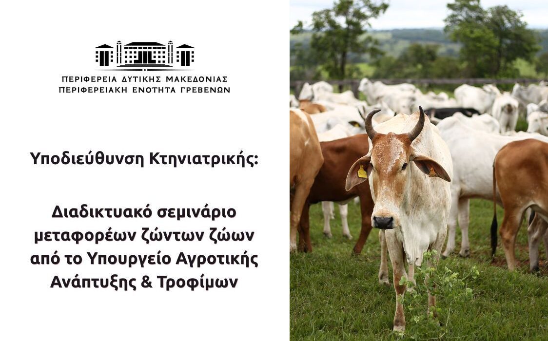Από την Υποδιεύθυνση Κτηνιατρικής Γρεβενών ανακοινώνεται ότι στις 2, 3 & 4 Φεβρουαρίου 2026 θα διεξαχθεί διαδικτυακά (εξ αποστάσεως) σεμινάριο μεταφορέων ζώντων ζώων από το Υπουργείο Αγροτικής Ανάπτυξης & Τροφίμων.