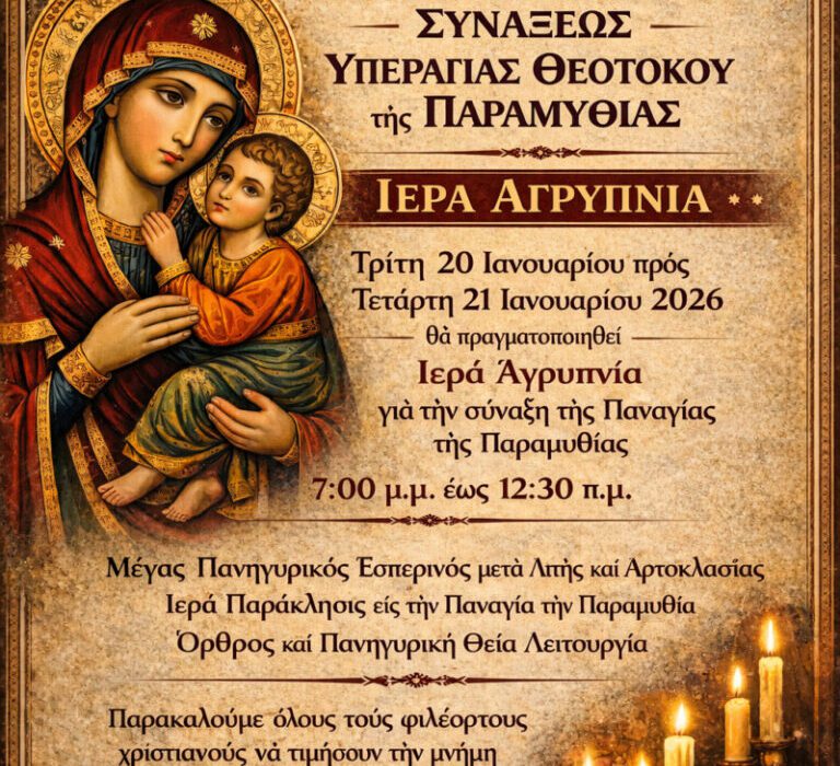 Η Ιερά Μητρόπολις Γρεβενών ανακοινώνει ότι στον Ιερό Μητροπολιτικό Ναό Ευαγγελισμού της Θεοτόκου – Αγίου Αχιλλείου Γρεβενών θα τελεσθεί Πανδήμως ο Εορτασμός της Συνάξεως της Υπεραγίας Θεοτόκου της Παραμυθίας.