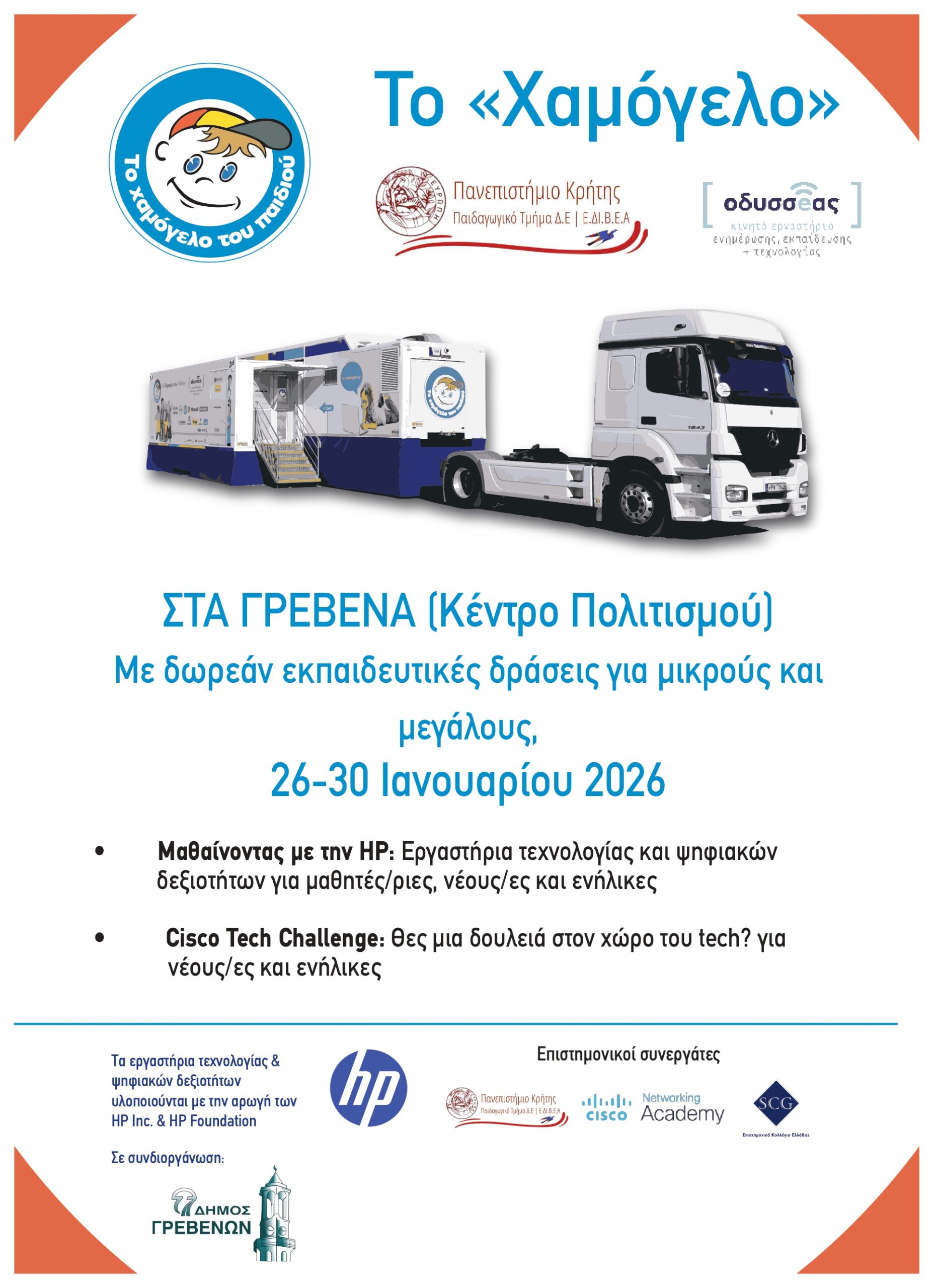«Το Χαμόγελο του Παιδιού» θα βρεθεί στα Γρεβενά από τις 26 έως και τις 30 Ιανουαρίου 2026, με το Κινητό Εργαστήριο Ενημέρωσης, Εκπαίδευσης και Τεχνολογίας «ΟΔΥΣΣΕΑΣ» και το επιστημονικό προσωπικό του με στόχο την παροχή δωρεάν δράσεων εκπαίδευσης και ενημέρωσης για μικρούς και μεγάλους που εστιάζουν στον ψηφιακό εγγραμματισμό και στα σύγχρονα κοινωνικά ζητήματα.