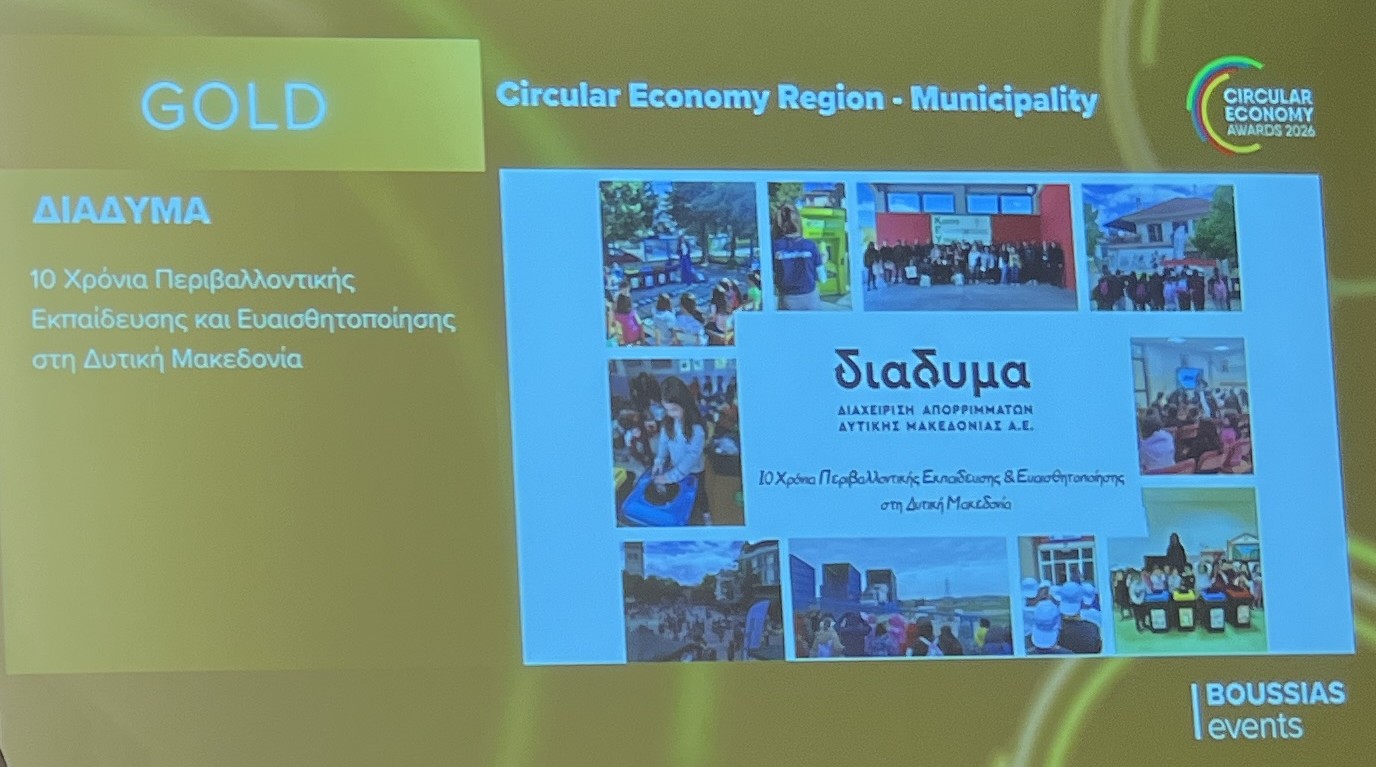 Η ΔΙΑΔΥΜΑ Α.Ε. τιμήθηκε με Χρυσό Βραβείο στα Circular Economy Awards 2026, για το πολυετές και ουσιαστικό έργο της στον τομέα της Περιβαλλοντικής Εκπαίδευσης και Ευαισθητοποίησης, συμπληρώνοντας δέκα χρόνια συνεχούς δράσης στη Δυτική Μακεδονία.