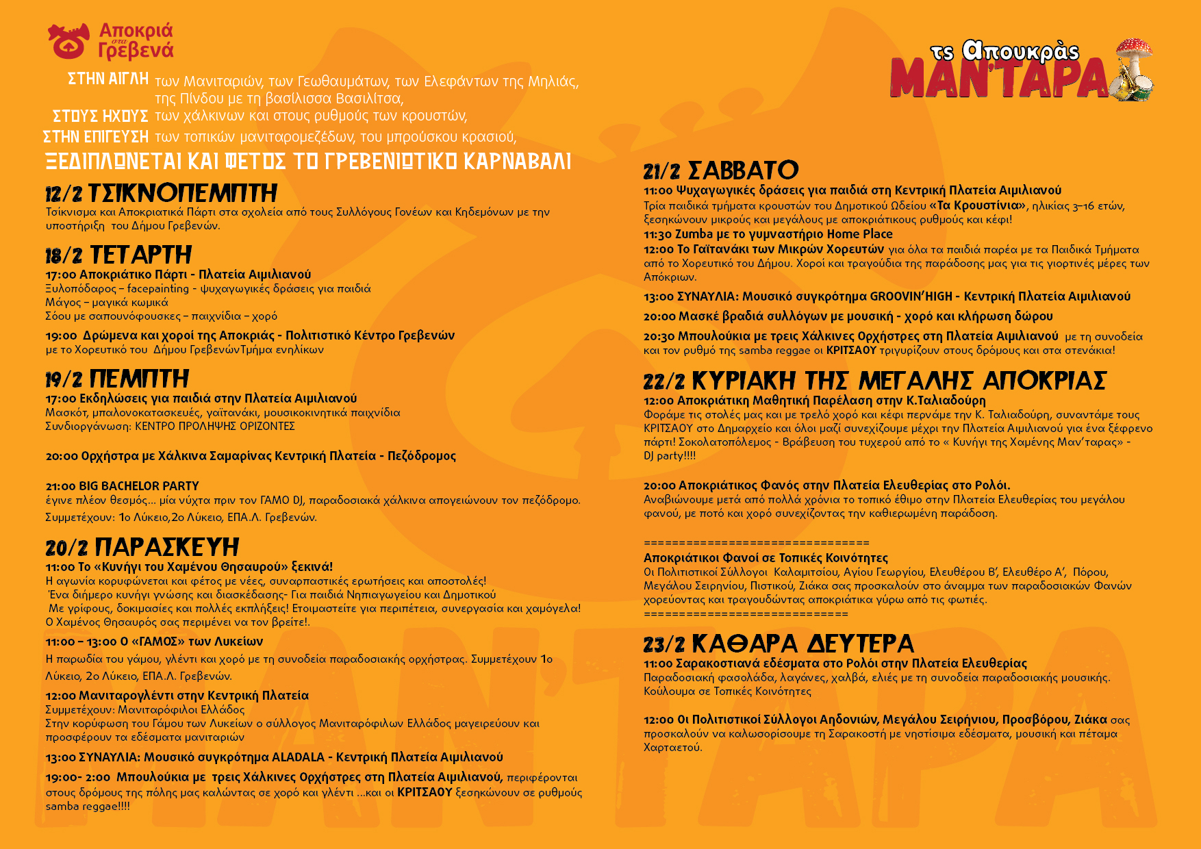 Στα Γρεβενά των μανιταριών και των γεύσεων, των χάλκινων και των κρουστών, της παράδοσης που αντηχεί στις πλατείες και στα σοκάκια και του κεφιού που ενώνει μικρούς και μεγάλους, ξεδιπλώνεται και φέτος το Γρεβενιώτικο Καρναβάλι «ΤΣ΄ ΑΠΟΥΚΡΑΣ ΜΑΝ’ΤΑΡΑ»!!!
