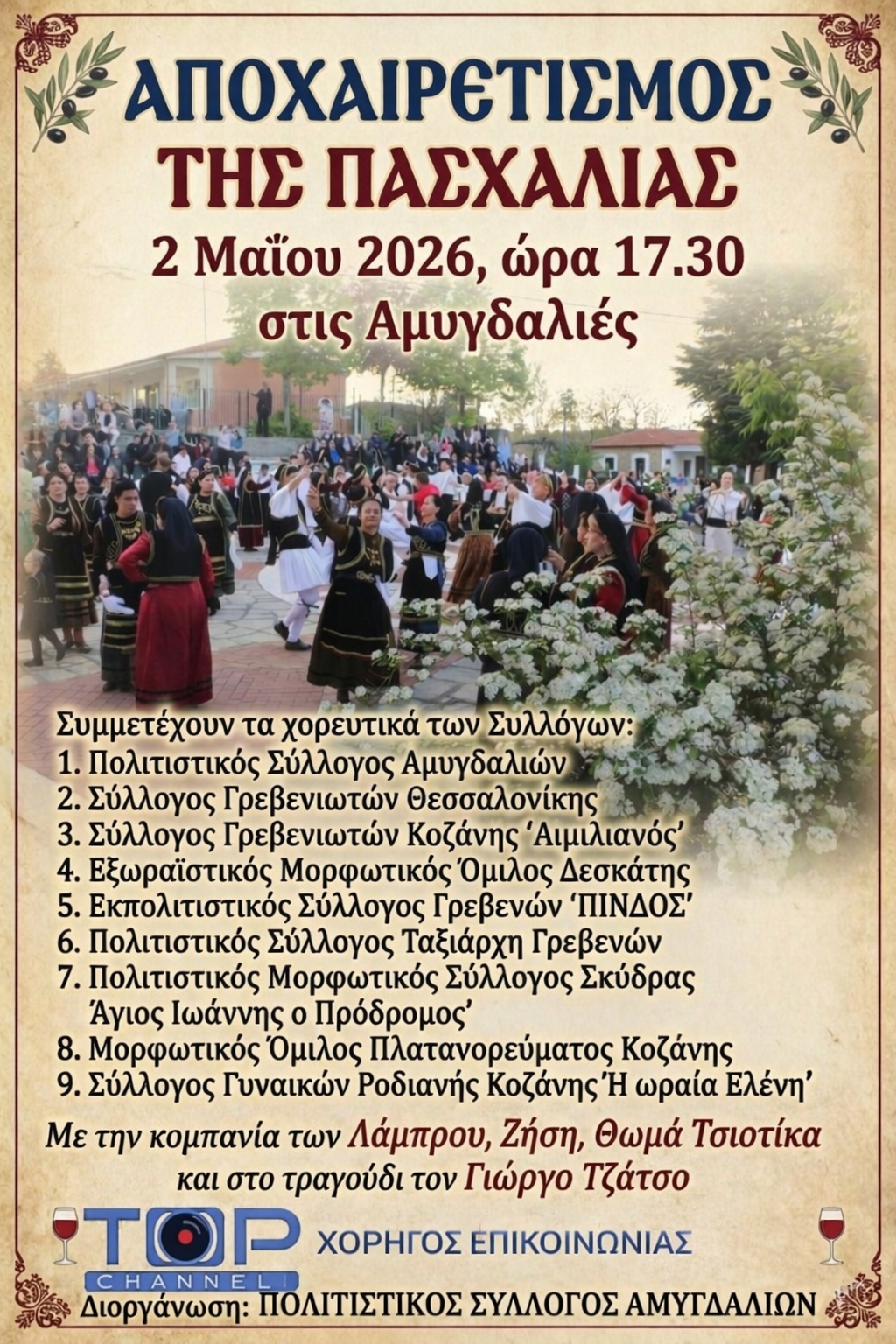 – Το χορευτικό τμήμα του Πολιτιστικού Συλλόγου Αμυγδαλιών θα παρουσιάσει με τον δικό του ξεχωριστό,αυθεντικό τρόπο τον παραδοσιακό αποχαιρετισμό της Πασχαλιάς.