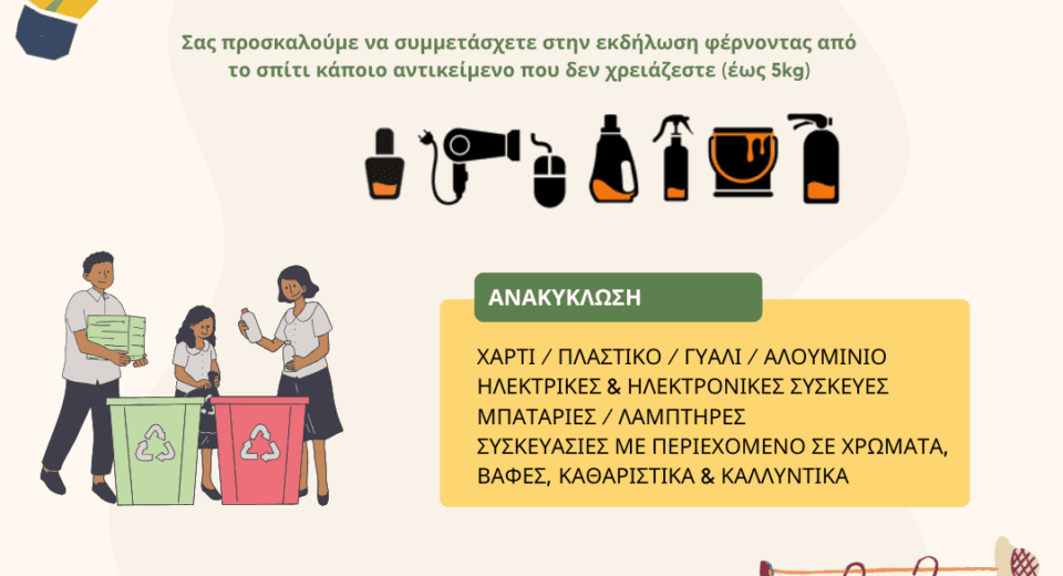 Την Τετάρτη 22 Απριλίου 2026 στις 10:00–13:00, θα λάβει χώρα στην κεντρική πλατεία της Εράτυρας, ενημερωτική εκδήλωση από τη ΔΙΑΔΥΜΑ ΑΕ σε συνεργασία με τον Δήμο Βοΐου. Οι πολίτες θα μπορούν να παραδώσουν επί τόπου εκτός των τυπικών υλικών συσκευασίας (χαρτί, γυαλί, πλαστικό, αλουμίνιο), απόβλητα ειδικών κατηγοριών όπως ηλεκτρικές & ηλεκτρονικές μικροσυσκευές, μπαταρίες, λαμπτήρες, συσκευασίες […]